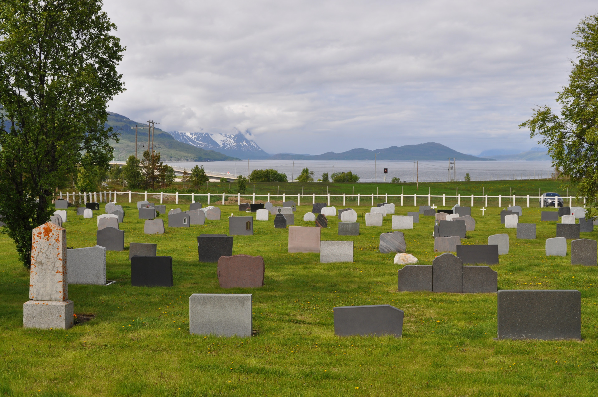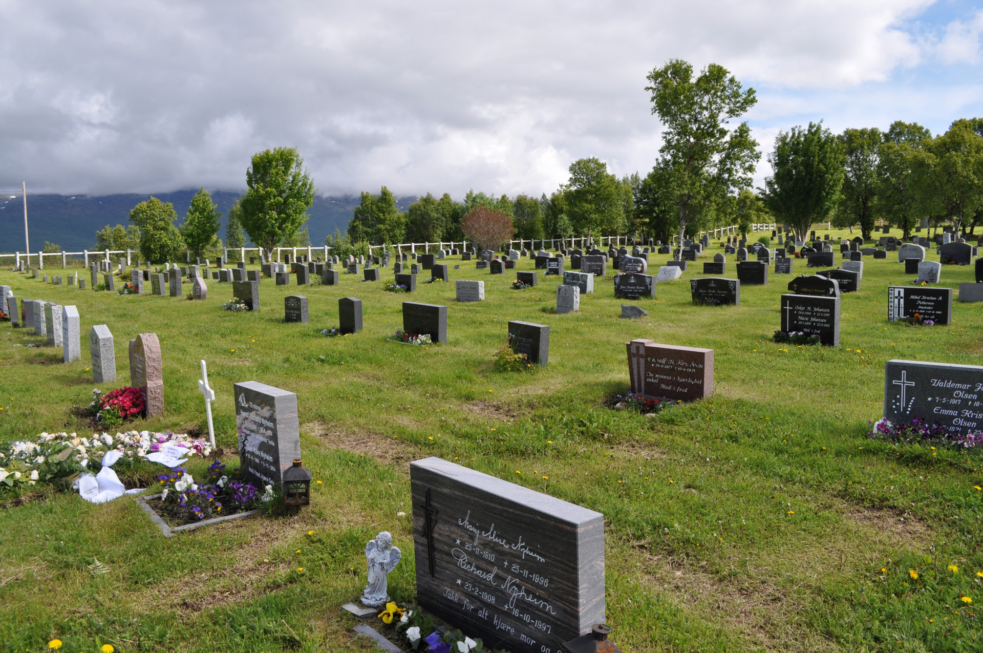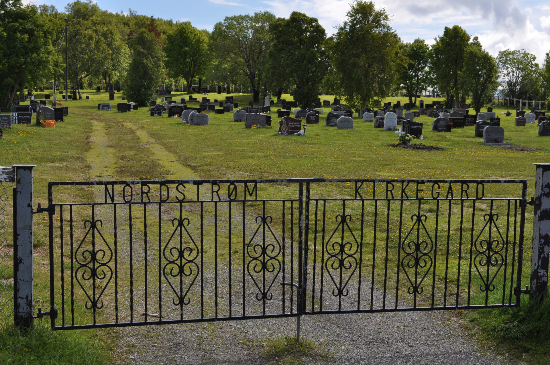 Wiejski cmentarz w miejscowości Nordstraumveien, przy drodze numer 6 w kierunku North Cup. Typowa stylistyka skandynawska, skromne groby, poszanowanie zmarłego i natury. Charakterystyczne dla regionu ozdoby, statuetki i reliefy gołębi. Autor zdjęć Jan Sz. Czerwiec 2019r.